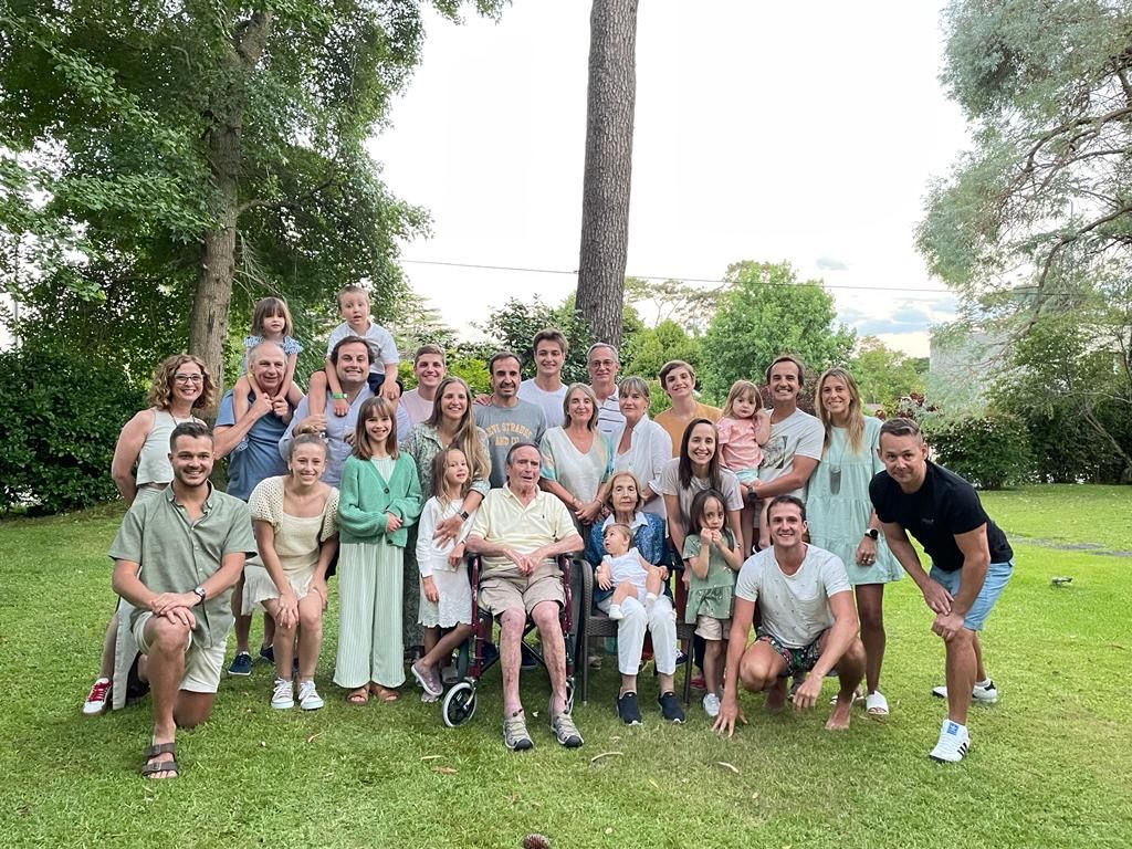 Acá están Papa y Mama, sentados tranquilos en el pasto, rodeados de todos. Vemos a Maria Noel, a Ana, y también están German y Denise, todos con una sonrisa. Y mirá a Gaston ahí, agachado, y la pequeña Candelaria en el regazo de Mama, qué ternura.